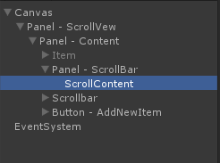 A simple scrollbar is used here to scroll the content. GameObject named Item is used as the content of the scroll view. Panel - ScrollBarGameObject contains Scroll-Rect and ScrollContent contains GridLayoutGroup component.