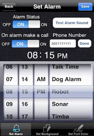 - Setup a call as an alarm. You can choose to call any number at the time the alarm goes up. This option is perfect for when you need to wake up your friend, remind your coworker to be at a meeting or call your son to remind him to take his medication! So clever! (Feature only available for iPhone, Ipods can still use the application but the calling feature is not available).